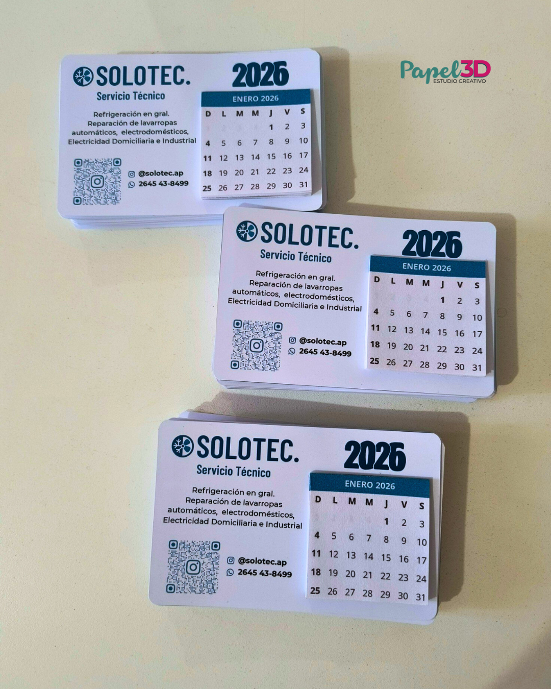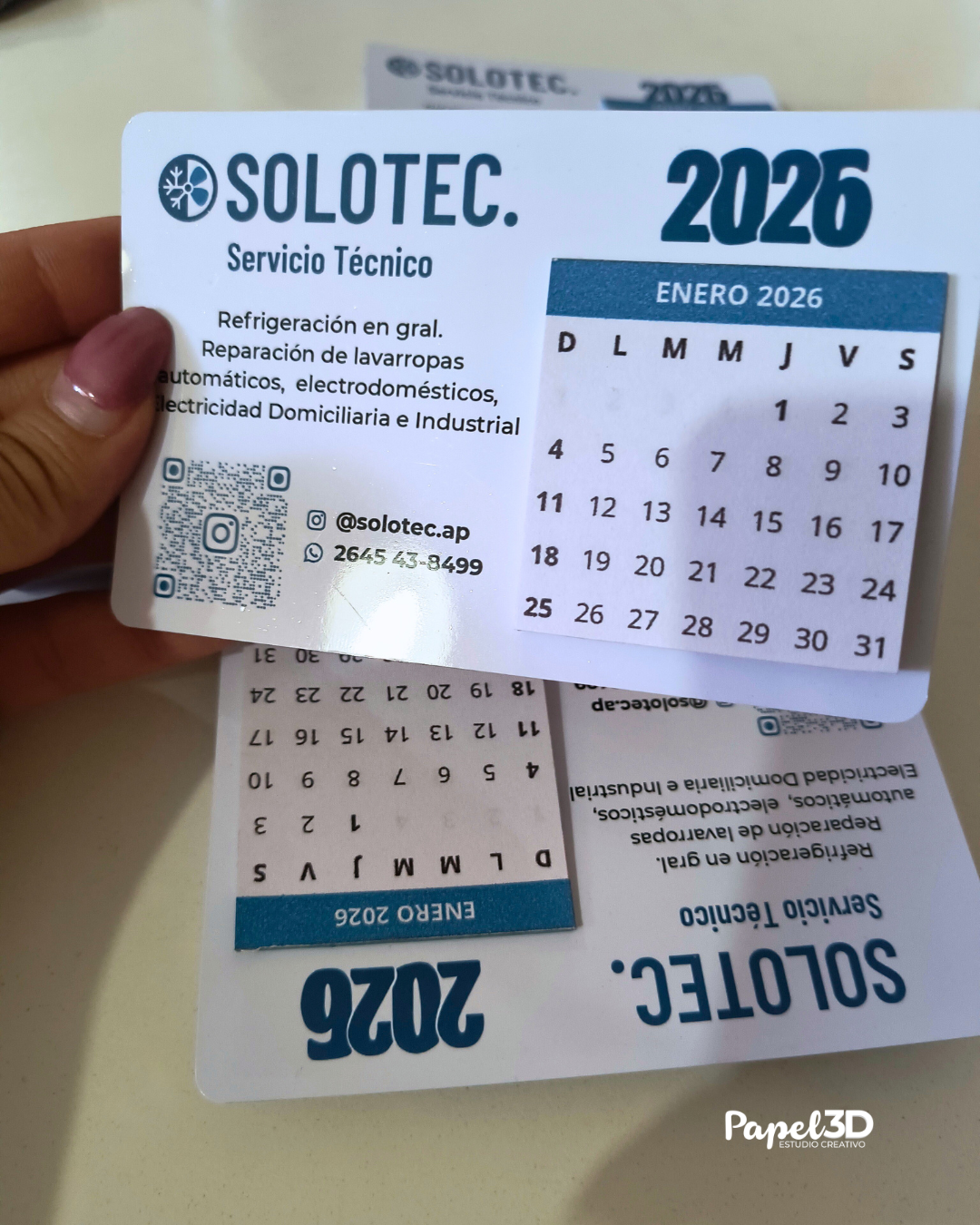 Este modelo incluye un código QR integrado con acceso directo a tus redes sociales, WhatsApp o catálogo digital, facilitando el contacto instantáneo con tus clientes. Además, incorpora un calendario mignon tipo talonario, que permite ir desprendiendo cada mes para mantener la información actualizada durante todo el año.