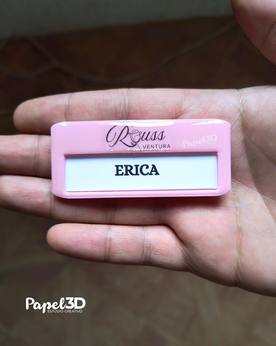 Pines identificadores con nombre y logo